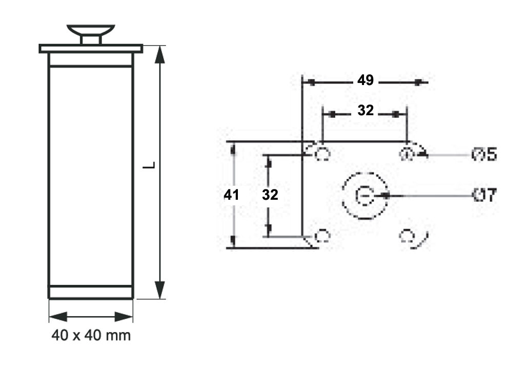 Nábytková štvorcová noha hliníková, povrchová úprava: imitácia nerezi. Rozmer: 40x40 mm. Výška 60 mm, Rektifikácia +15 mm.