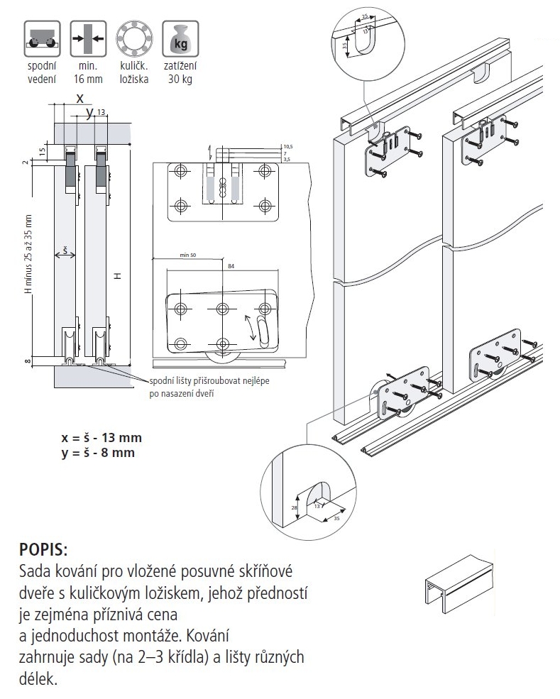 Sada posuvného kovania na skriňové posuvné dvere, nosnosť 30 kg/dvere, sada pre dvoje dvere. K dispozícii vedenie pre dĺžky 1,2m, 2m a 3m.