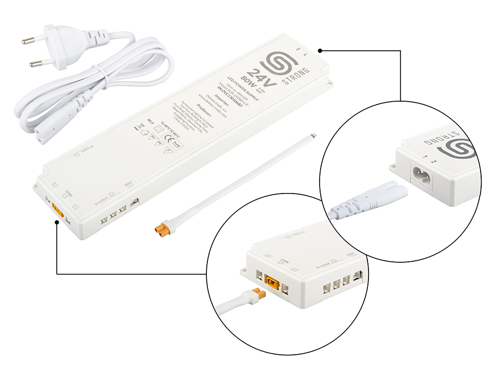 Napájacie zdroje StrongLumio s integrovaným rozbočovačom a adaptérom 3PIN pre pripojenie senzoru/vypínača si kladú za cieľ zjednodušiť montáž osvetlenia do nábytku, skrátiť čas inštalácie a tým celkovo spríjemniť prácu so svetlami značky StrongLumio.