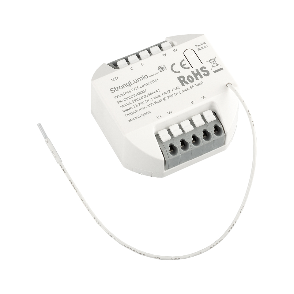 Riadiaca jednotka pre dvojžilové CCT pásiky - umožňuje reguláciu teploty bielej farby. Pre reguláciu jasu i teploty vyžaduje aspoň 2 tlačítkový vypínač viď. súvisiaci sortiment. V prípade pripojenia jednofarebného pásika alebo jednotlačitkového vypínača funguje ako klasický stmievač. Svorkovnice k zacvaknutiu, max 2x3A . Rozmery - 52x52x23 mm. Doporučený LED pásik viď súvisiaci sortiment.