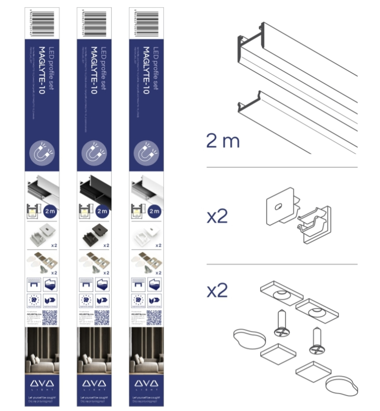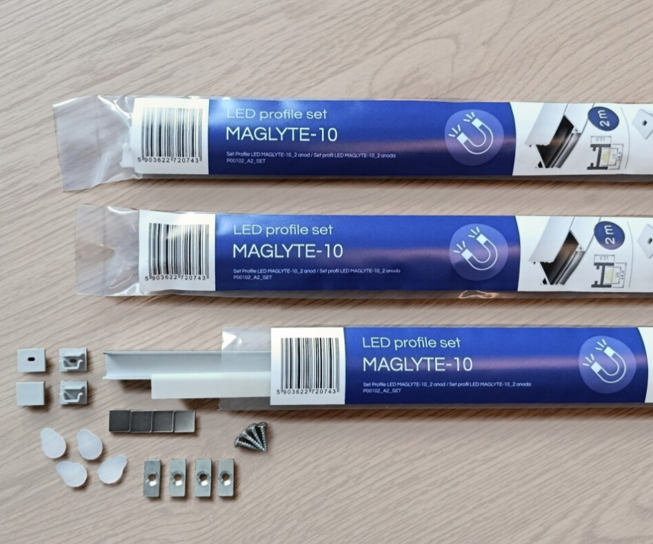 Sada s LED profilem Maglyte-10 strříbrná elox v délce 2030mm včetně příslušenství (1x krycí lišta mléčná, 1x sada koncovek s otvorem, 1x sada koncovek bez otvoru, 2x sada magnetických držáků). Sada umožňuje sestavení jednoho dvoumetrového nebo dvou jednometrových LED svítidel. Ideální řešení pro velkoobchody a samoobslužné prodejny. Estetické a odolné balení, čitelná etiketa.