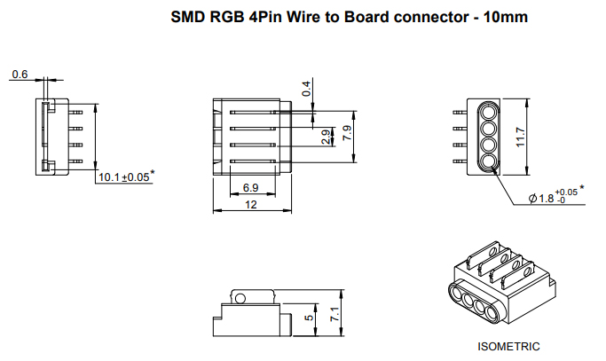 Spojka pre spojenie RGB LED pásik - kábel (štvorlinka). Vhodné pre LED pásiky šírky 10mm viď. súvisiaci sortiment. Spojka sa na LED pásik nasadí a pomocou klieští sa pritlačia kontaktné tŕny do LED pásika, kde sa tŕny potom do LED pásika zarežú. Spojka je teda určená na jedno použitie. pre použitie v profiloch o min. šírke 12mm a výške 5,1mm.