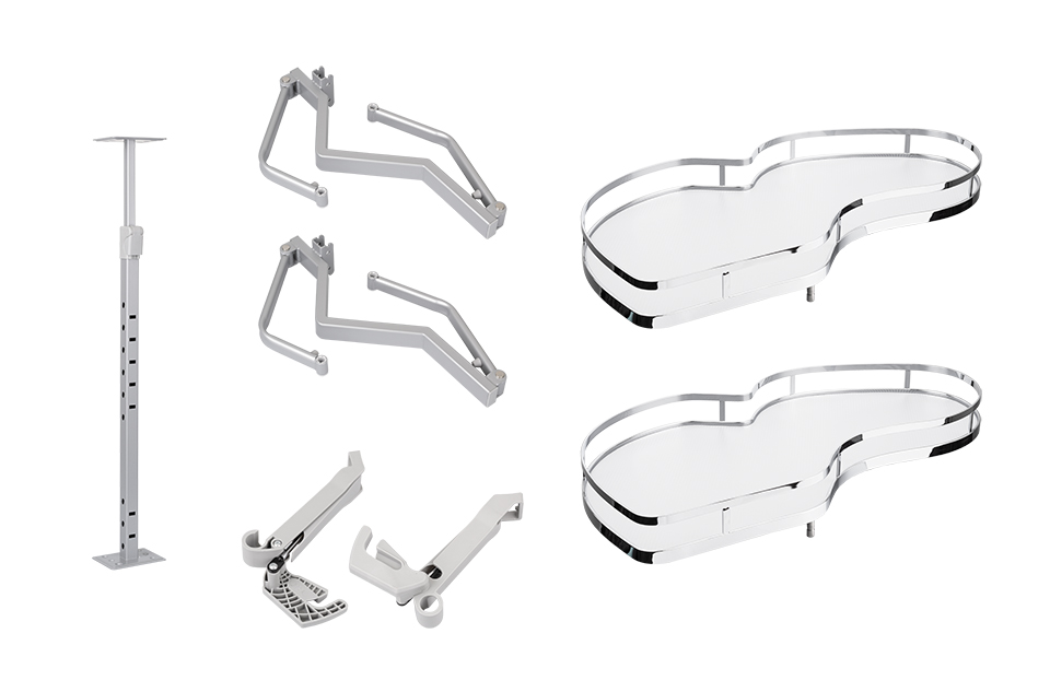 Zobraziť všetky prevádzkySada 2 výsuvných polic pre spodnú rohovú skríňku. Ľavá varianta pri zatvaraní s dotĺmením.