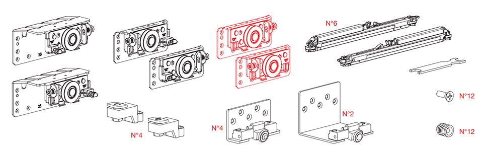 Súprava kovania pre 3 krídla vrátane vzduchových tlmičov (6 ks). Hrúbka lamina max.28mm. Pre hmotnosť krídla max 80 kg. Min.šírka krídla - 750mm. Upozorňujeme, že pri tomto type kovania je krídlo zavesené mimo ťažiska a môže dôjsť k prehybu krídla (platí všeobecne pre naložené systémy). Na vyrovnanie napätia slúžia výstuhy dverí viď. súvisiaci sortiment.