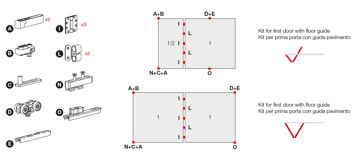 Sada kovania pre prvé dvojkrídlo. Obsahuje dve magnetické aretácie a tri medzidverné závesy. Verzia so spodným vedením. Pre výšku dverí max. 2400mm, nosnosť 80kg/1 krídlo. V prípade štyroch dverí - 40kg/1 krídlo, šiestich dverí - 25 - 30kg/1 krídlo. Hrúbka materiálu 35 - 45mm. Farba čierna (práškovo lakovaná).