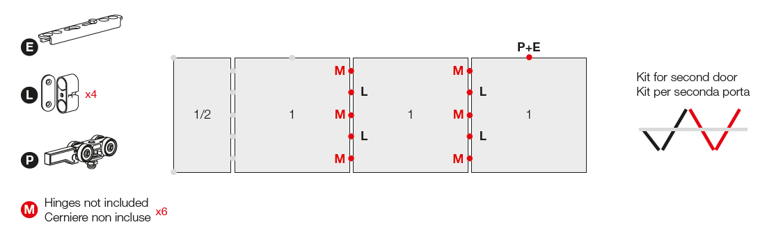 Sada kovania pre posúvne dvojkrídlo. Obsahuje štyri magnetické aretácie, bez skladacích a medzidverných závesov. Verzia bez spodného vedenia. Pre výšku dverí max. 2400mm, nosnosť 40kg/1 krídlo. V prípade šiestich dverí - 25 - 30kg/1 krídlo. hrúbka materiálu 30 - 45mm. Farba čierna (práškovo lakovaná).