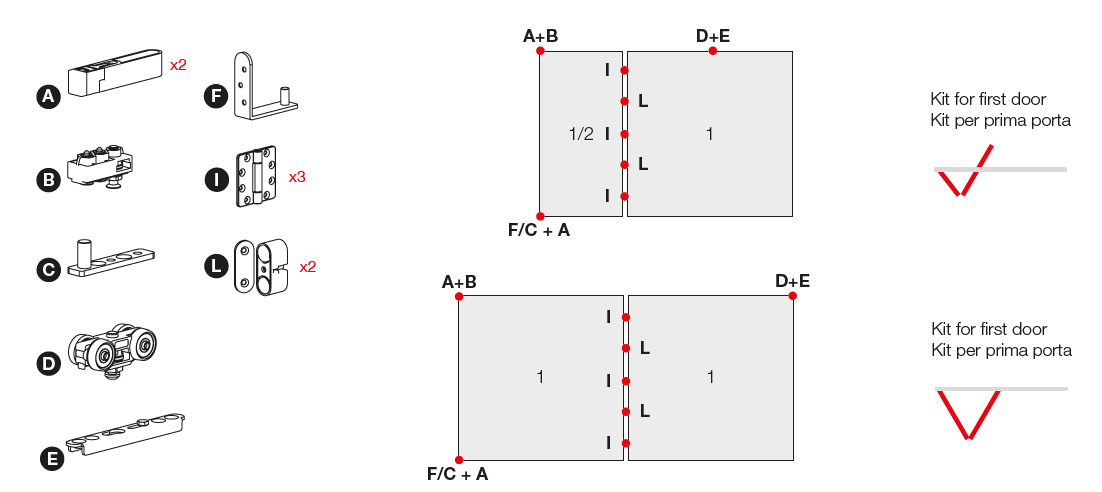 Sada kovania pre dve krídla s mezidvernými závesmi (3 ks) a magnetickou aretáciou (2 ks). Verzia bez spodného vedenia. Pre výšku dverí max. 2400mm, nosnosť 80kg/1 krídlo. V prípade štyroch dverí - 40kg/1 krídlo, šiestich dverí - 25 - 30kg/1 krídlo. Hrúbka materiálu 35 - 45mm. Farba čierna (práškovo lakovaná). https://www.ternoscorrevoli.com/en/catalogue/sliding-door-systems/versatile Detail produktu na stránkach výrobcu.