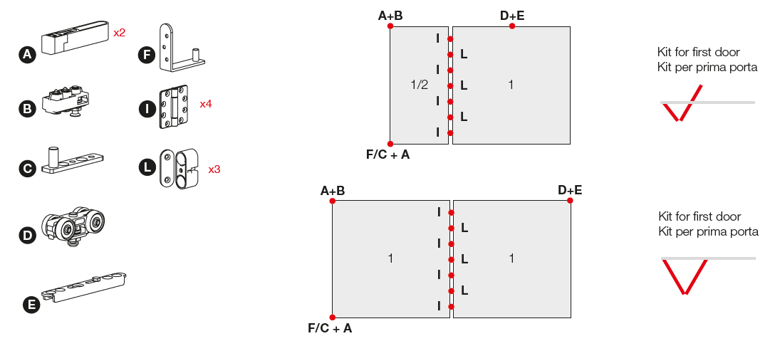 Sada kování pro dvě křídla s mezidveřními  závěsy (4 ks) a magnetickou aretací ( 3 ks). Verze bez spodního vedení. Pro výšku dveří 2400 - 3000mm, nosnost 80kg/1 křídlo. V případě čtyř dveří - 40kg/1 křídlo, šesti dveří - 25 - 30kg/1 křídlo.Tloušťka materiálu 35 - 45mm. Barva černá (práškově lakovaná).
