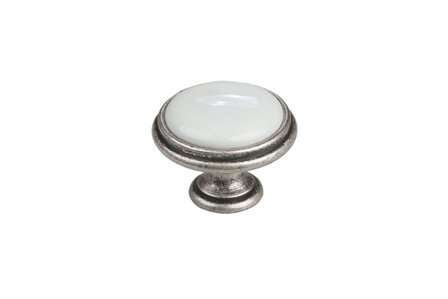 Knop povrchová úprava starostriebro / porcelán biely, priemer 35 mm, výška 27 mm. skrutky nie sú súčasťou balenia.