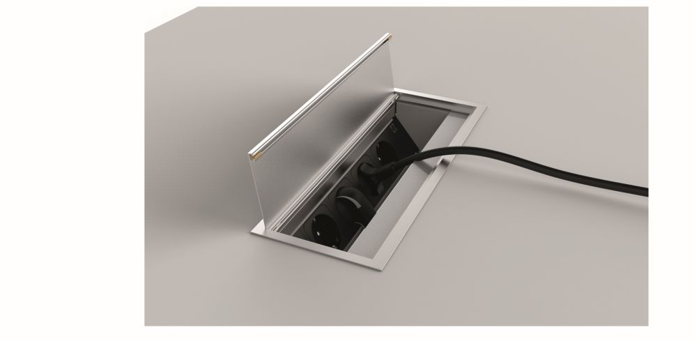 Kompletný kancelársky systém s 2 el.zásuvkami, 2 dátovými konektormi RJ45 a videokonektorom HDMI vrátane hliníkovej priechodky 240x120 mm a uchytenie, ktorý sa obvykle umiestňuje do pracovnej plochy stolu.