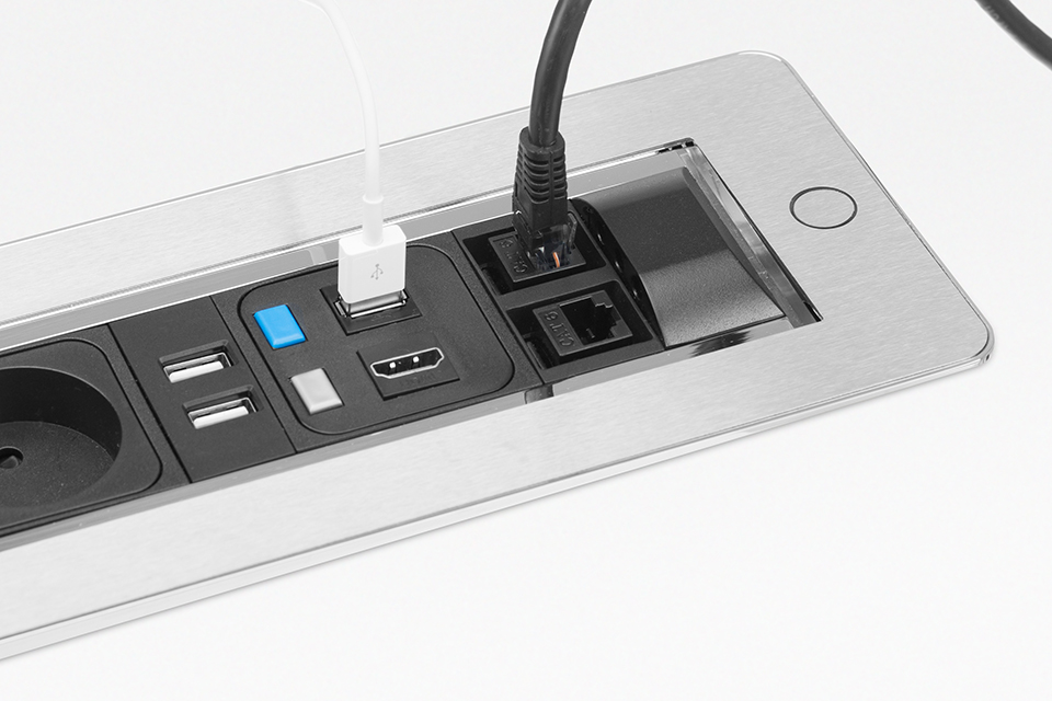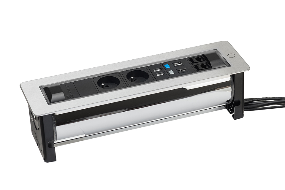 Versaturn je elektronicky riadená moderná dizajnová zásuvka určená pre zabudovanie do stolov v kanceláriách, zasadacích miestnostiach alebo hoteloch.