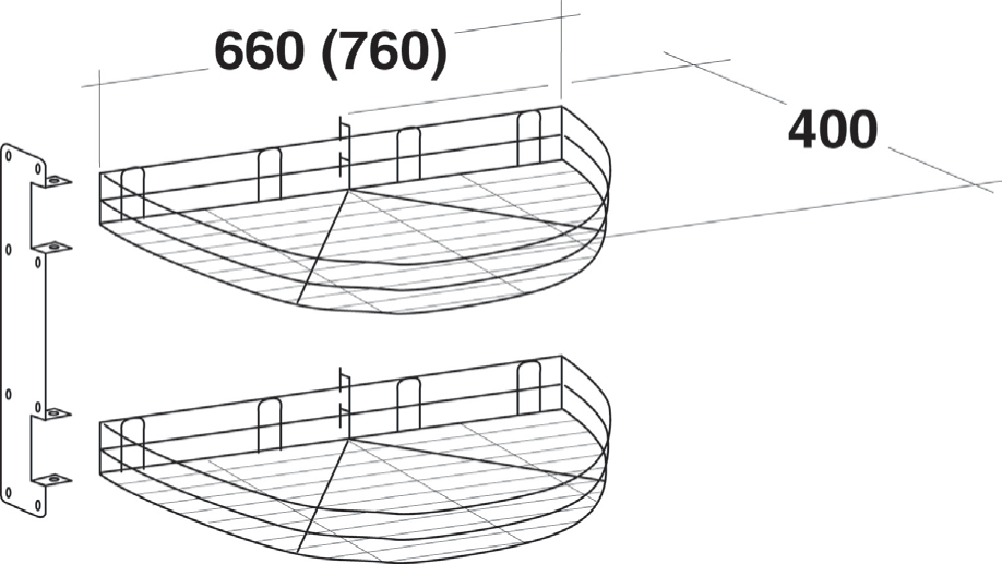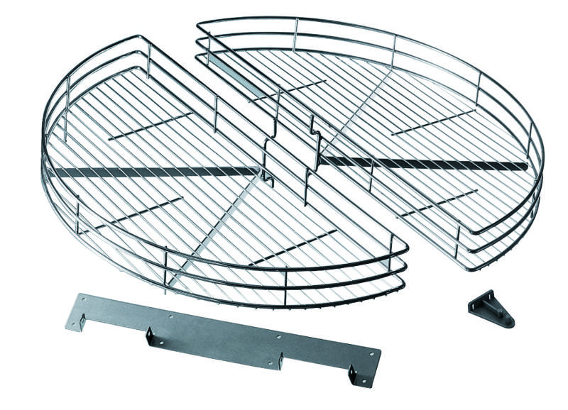 Výrobok umožňuje lepšie využitie priestoru rohových skríň kuchynského nábytku. Prevedenie chrom. Obsahuje dva polkruhové koše, prípravok k ich zaveseniu, plastovú úchytku spodného koša, 2x vrut. šírka: 760 mm