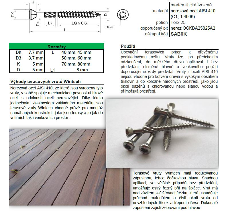 Základné znaky: Zosílená hlava zaisťujúca väčšiu mechanickú odolnosť. Ostrý rezný brit na špičke umožňujúci aplikáciu bez predvrtania. Začisťovacia frézka uprostred vrutu. Zebrovanie pod hlavou. Redukovaná zápustná, ľahko šošovkovitá hlava. Martenzitická tvrdená nerezová oceľ AISI 410. Tento terasový vrut je vyrobený z ocele AISI410. To znamená, že je pevný a odolávajúci korózii a je použiteľný vo vonkajšom prostredí. Má výraznú, zápustnú a ľahko šošovkovitú hlavu s drážkovaním zo spodnej strany. Pohon vrutu TORX v celej rozmerovej rade poukazuje na možnosť vysokých točivých momentov. Vrut má čiastočný závit s frézičkou a rezný brit. Masívné telo vrutu ju predurčuje k viacúčelovému použitiu. Hodí sa pre zhotovovanie terás, fasád, lavičiek, altánov a ďalších drevostavieb.