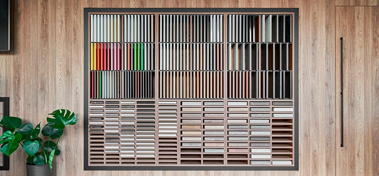 Čo nás ešte zaujalo je miesto, v ktorom sú uložené vzorky dosiek pre skrinky, dvierka a pracovné dosky. Elegantný štýl, ktorý presne zapadne do celého showroomu. Vlastne viac ako regál so vzorkami, pôsobí ako knihovňa.