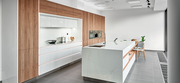 V štúdiu Elements design si dali naozaj záležať. Kuchyňa, ktorú tu vystavujú, je skutočne ako zo života, vrátane funkčných spotrebičov a vnútornej výbavy.