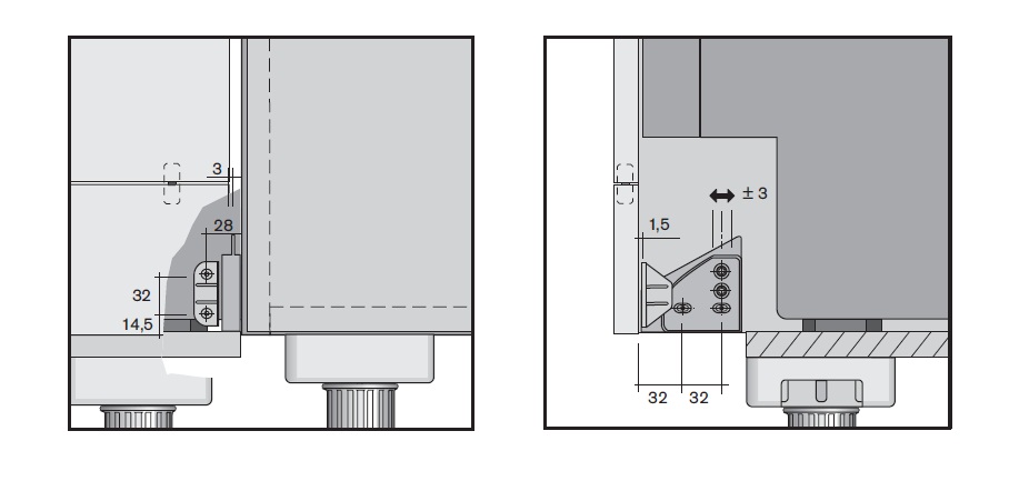 Vedenie pre spodnú sklopnú časť čela u vstavanej úmývačky. Použitie u zvýšených korpusov kuchynskej linky. Zabráňuje kolízii dvierok umývačky so soklom kuchyne. Použitie pri plánování v tzv. 6-ti rastru (viď. obrázok 6rastr) . Vedenie sa montuje na súsediaci korpus. V balení len 1ks, na jedny dvierka nutné kúpiť 2ks. Nutné taktiež doplniť o 2ks pantov "hrana-hrana" viď súvisiaci sortiment.
